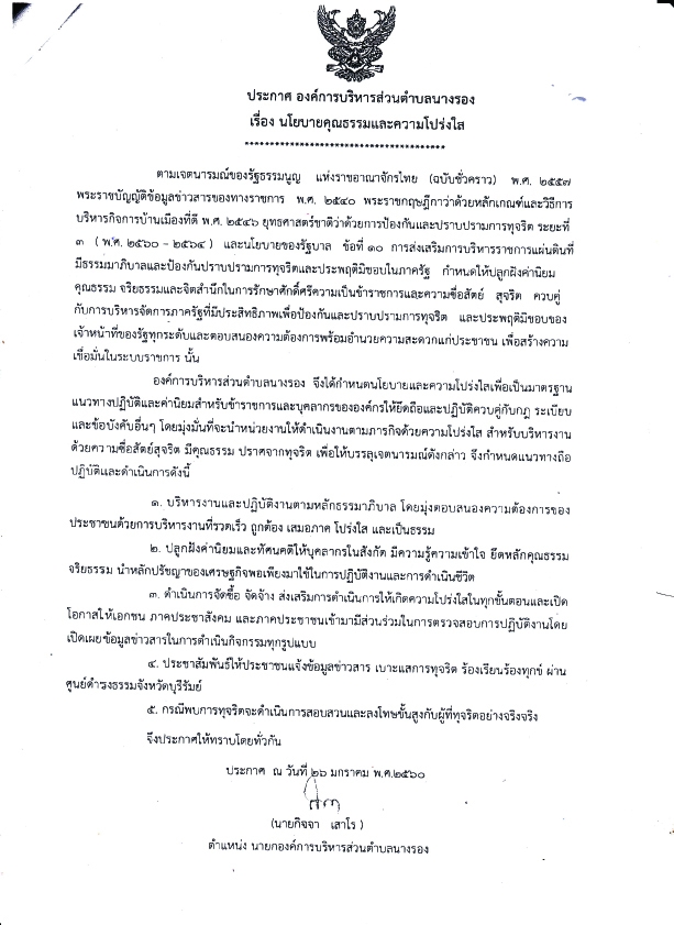 ประกาศองค์การบริหารส่วนตำบลนางรอง เรื่อง นโยบายคุณธรรมและความโปร่งใส ณ วันที่ 26 มกราคม 2560