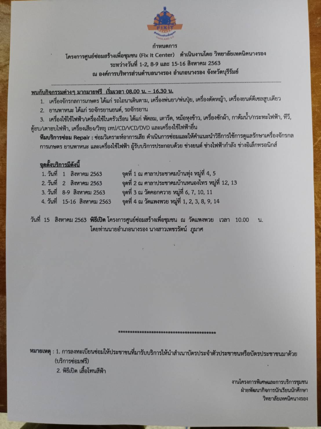 แจ้งกำหนดการโครงการศูนย์ซ่อมสร้างเพื่อชุมชน