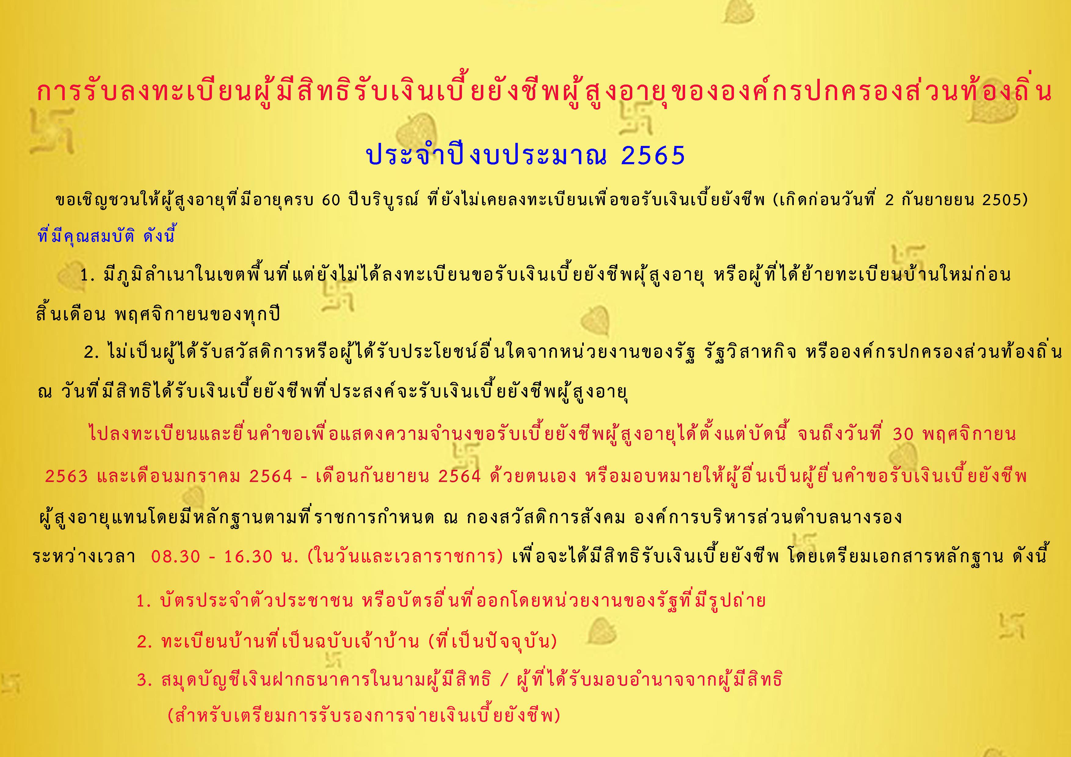 ประชาสัมพันธ์ การรับลงทะเบียนผู้มีสิทธิรับเงินเบี้ยยังชีพ ประจำปีงบประมาณ 2565