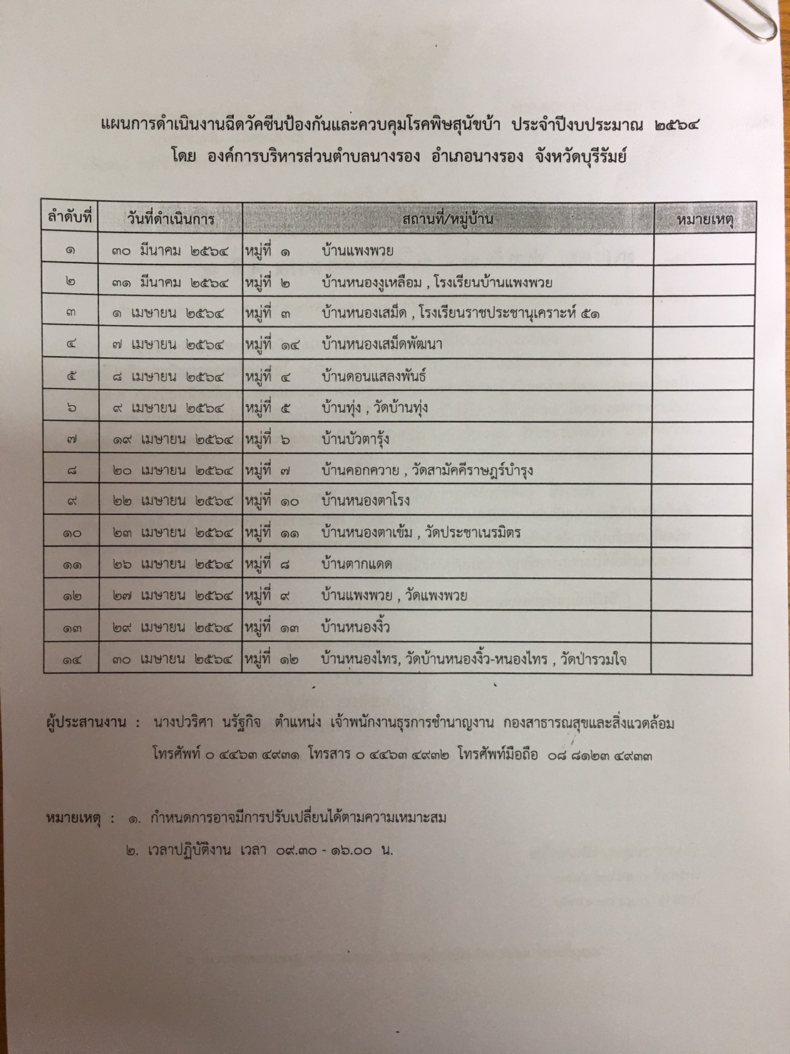 องค์การบริหารส่วนตำบลนางรอง ได้กำหนดออกแผนการดำเนินงานฉีดวัคซีนป้องกันและควบคุมโรคพิษสุนัขบ้า ประจำปีงบประมาณ 2564