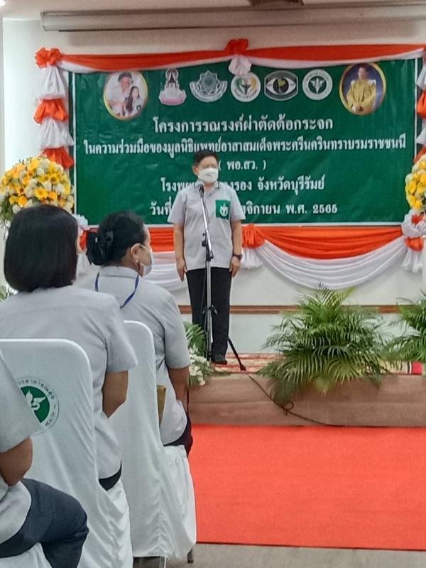 มอบหมายให้ นางสำรวม รอดจากเข็ญ รองนายกองค์การบริหารส่วนตำบลนางรอง เข้าร่วมเป็นเกียรติโครงการรณรงค์ผ่าตัดต้อกระจก ประจำปี 2565 ณ ห้องประชุมตึกอุบัติเหตุและฉุกเฉิน โรงพยาบาลนางรอง