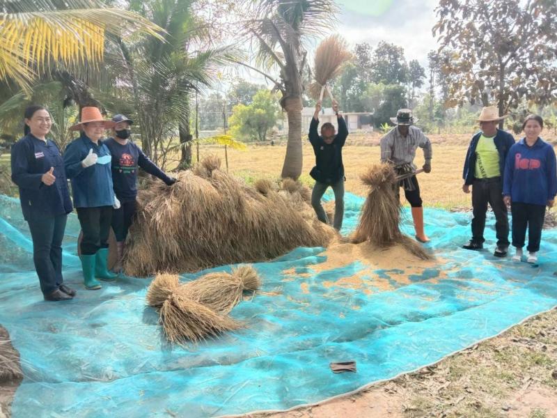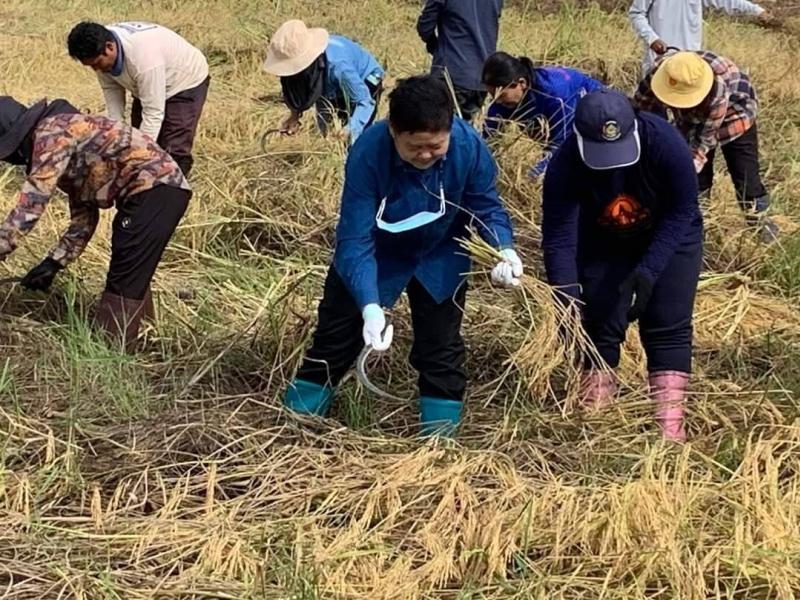 พร้อมคณะผู้บริหาร สมาชิกสภาฯ และผู้นำหมู่บ้าน ร่วมกิจกรรมลงแขกเกี่ยวข้าว เอามื้อสามัคคี แปลงครัวเรือนต้นแบบโคกหนองนา พัฒนาชุมชน นายประทิน ประทุมทอง ณ บ้านคอกควาย หมู่ที่ 7 ตำบลนางรอง อำเภอนางรอง จังหวัดบุรีรัมย์
