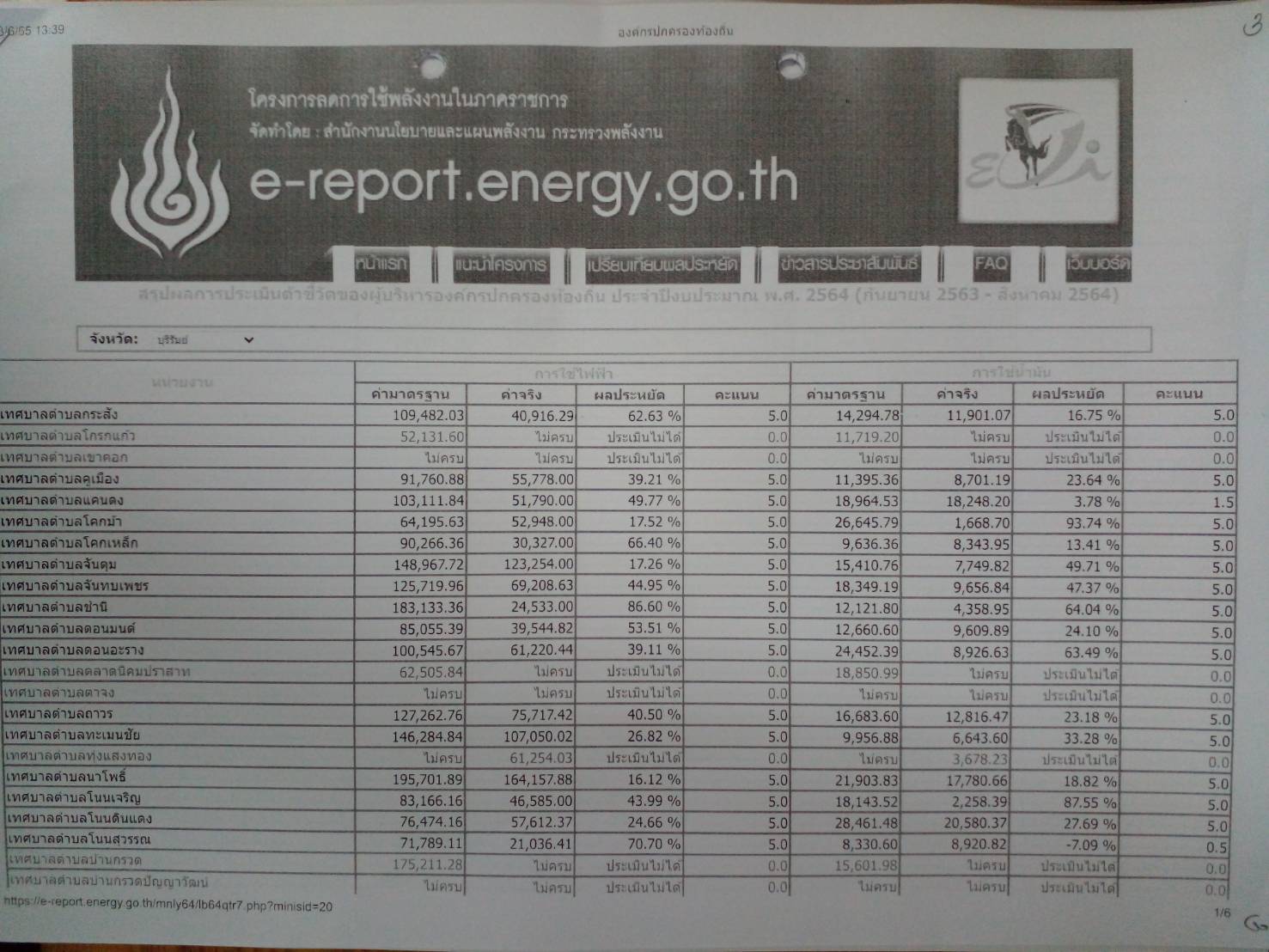 เรื่อง รายงานผลการปฏิบัติงานของคณะทำงานลดการใช้พลังงานไฟฟ้าและสรุปผลการประเมินตัวชี้วัดของผู้บริหารองค์กรปกครองส่วนท้องถิ่น ประจำปีงบประมาณ พ.ศ.2564 (กันยายน 2563 - สิงหาคม 2564)