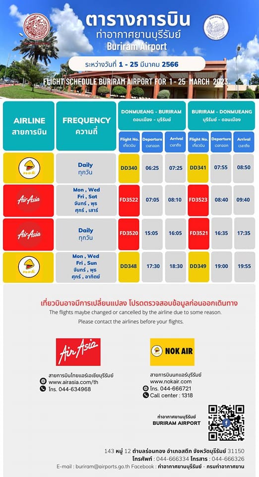 ประชาสัมพันธ์จาก ท่าอากาศยานบุรีรัมย์ ขอแจ้งตารางการบิน