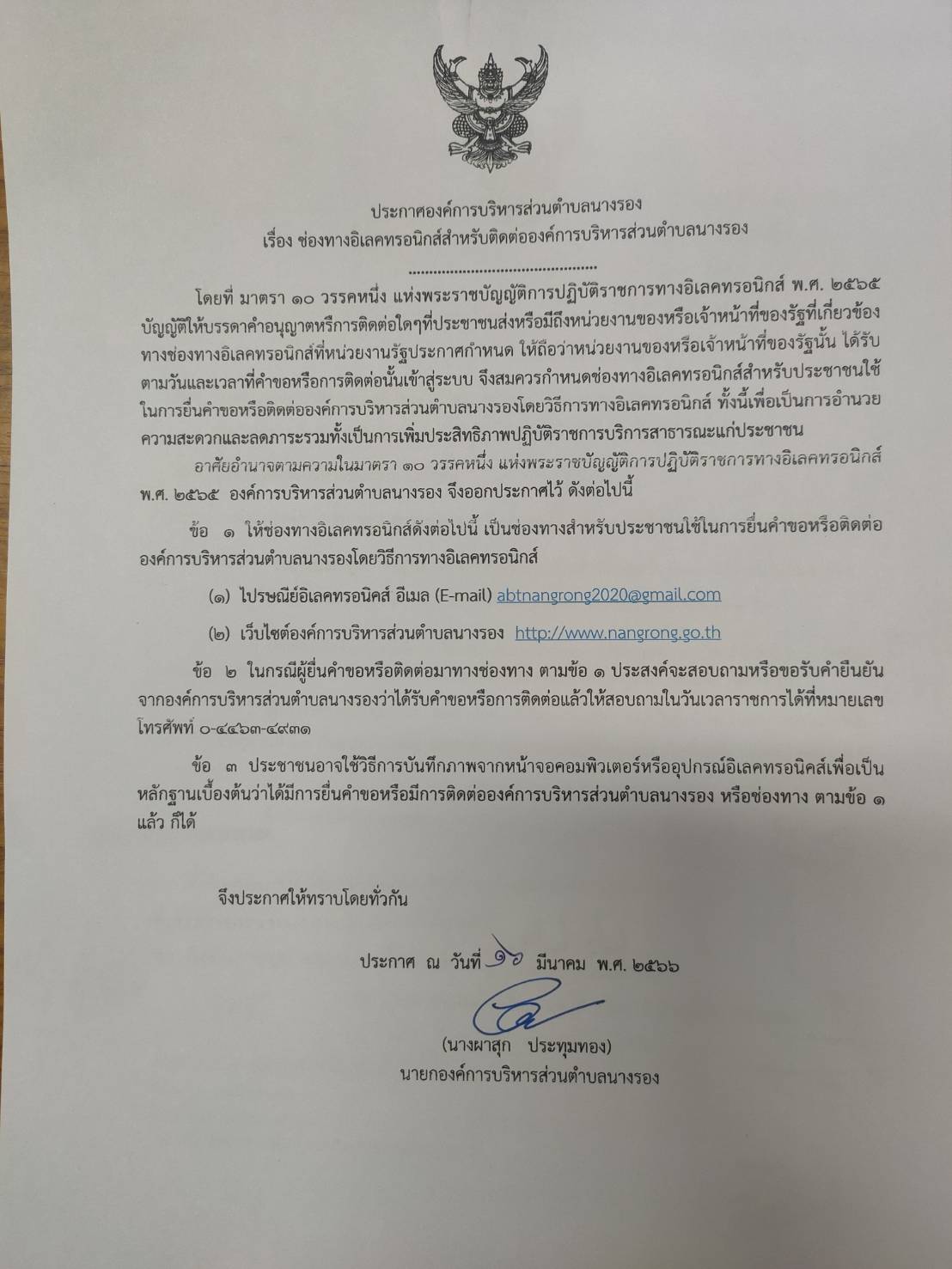 ช่องทางอิเล็กทรอนิกส์สำหรับติดต่อองค์การบริหารส่วนตำบลนางรอง พ.ศ.2566