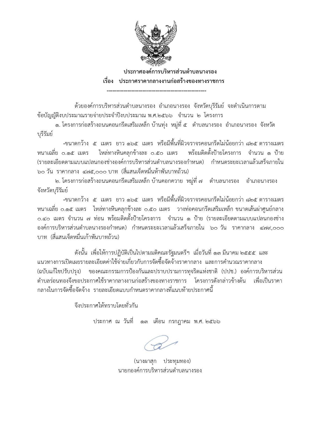 ประกาศราคากลางโครงการก่อสร้างถนนคอนกรีตเสริมเหล็ก บ้านคอกควาย หมู่ที่ 7