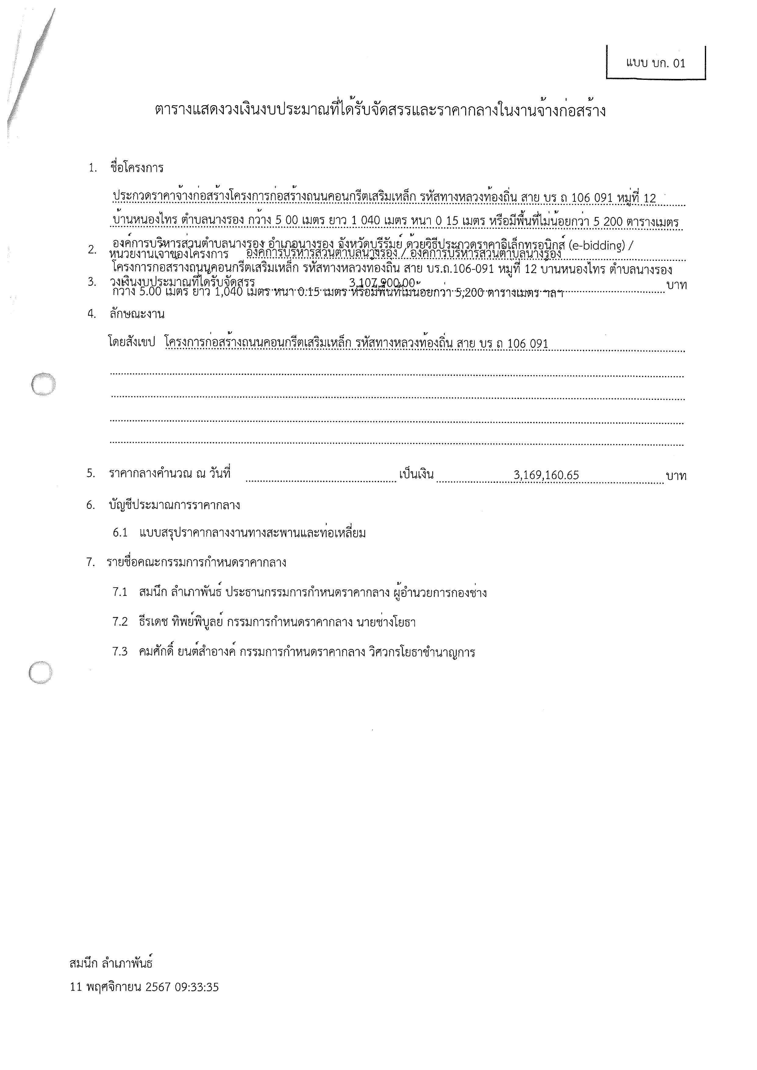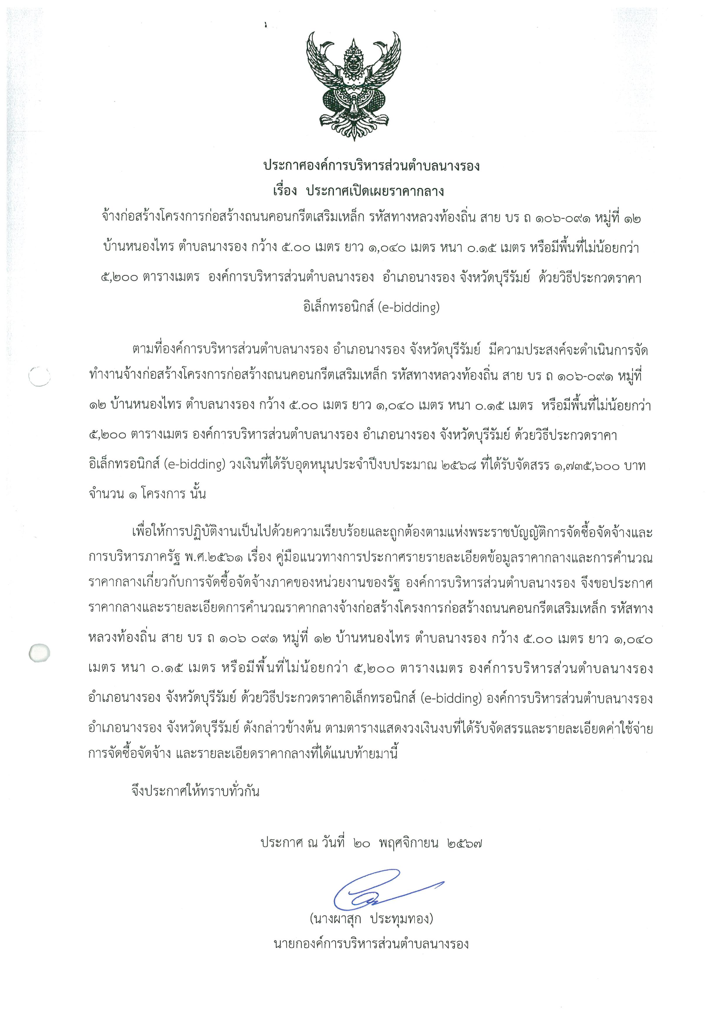 โครงการก่อสร้างถนนคอนกรีตเสริมเหล็ก หมู่ที่ 12 บ้านหนองไทร