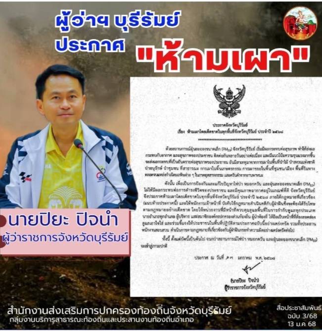 ประกาศจังหวัดบุรีรัมย์ เรื่อง ห้ามเผาโดยเด็ดขาดในทุกพื้นที่จังหวัดบุรีรัมย์