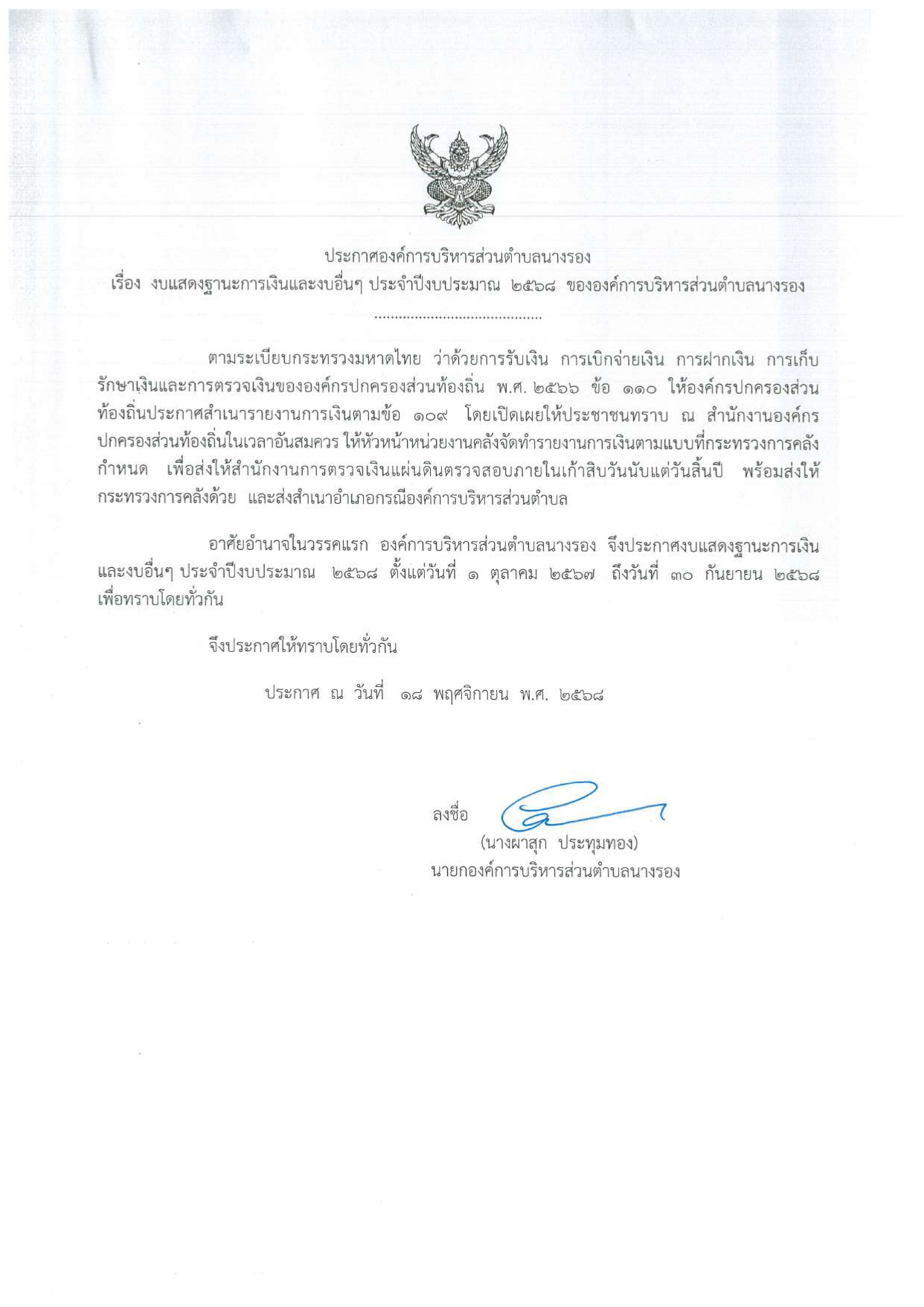 ประกาศองค์การบริหารส่วนตำบลนางรอง