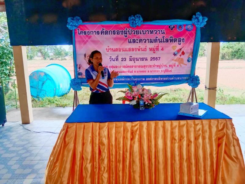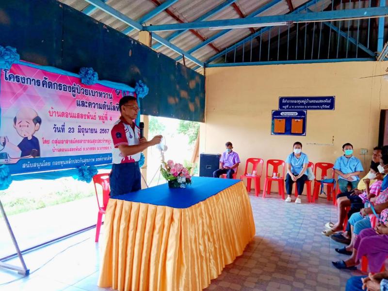 ร่วมพิธีเปิดโครงการคัดกรองผู้ป่วยเบาหวานและความดันโลหิตสูง ณ บ้านดอนแสลงพันธ์ หมู่ที่ 4ตำบลนางรอง อำเภอนางรอง จังหวัดบุรีรัมย์ งบประมาณโดยกองทุนหลักประกันสุขภาพองค์การบริหารส่วนตำบลนางรอง