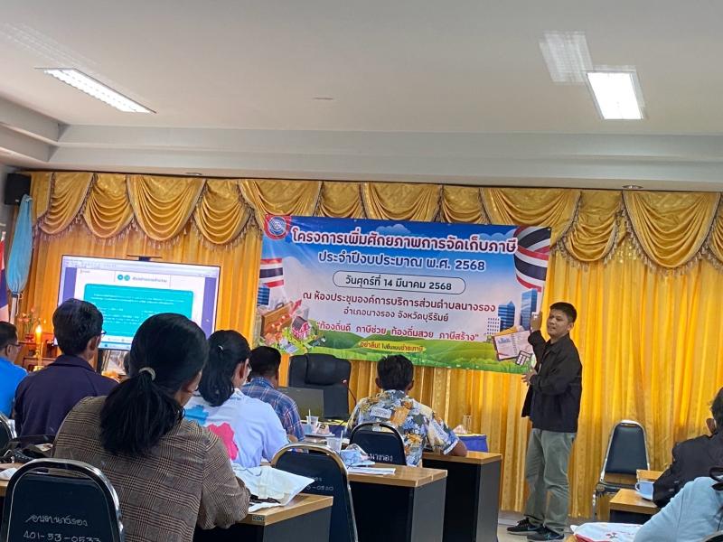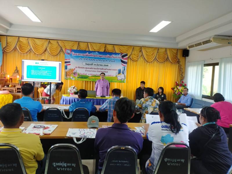 นางผาสุก ประทุมทอง นายกองค์การบริหารส่วนตำบลนางรอง ประธานในพิธีเปิดโครงการเพิ่มศักยภาพการจัดเก็บภาษี ประจำปีงบประมาณ พ.ศ.2568 โดยมีนางนันทิยา พิพัฒน์ภานุกูล ปลัดองค์การบริหารส่วนตำบล กล่าวรายงานวัตถุประสงค์ ณ ห้องประชุมชั้น 2 องค์การบริหารส่วนตำบลนางรอง อำเภอนางรอง จังหวัดบุรีรัมย์