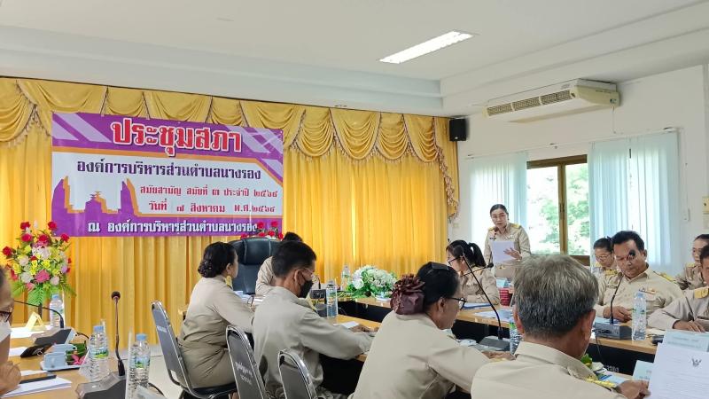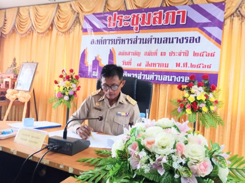 การประชุมสภาองค์การบริหารส่วนตำบลนางรอง สมัยสามัญ สมัยที่ 3 ประจำปี 2568 วันที่ 7 สิงหาคม 2568 โดยมีสมาชิกสภา นายกองค์การบริหารส่วนตำบลนางรอง คณะผู้บริหาร หัวหน้าส่วนราชการ กำนัน ผู้ใหญ่บ้าน ภาคีเครือข่าย และประชาชนทั่วไป เข้าร่วมประชุมสภาฯ ณ ห้องประชุมชั้น 2 องค์การบริหารส่วนตำบลนางรอง